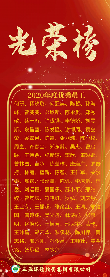 公司取得的優(yōu)異成績(jī),離不開我們?nèi)w環(huán)投人的共同努力,是我們?nèi)旧舷氯翰呷毫?,勠力同心,奮楫篤行的成果。在我們環(huán)投人的隊(duì)伍中,涌現(xiàn)出了一大批管理科學(xué)、敢于創(chuàng)新的先進(jìn)集體和盡職盡責(zé)、勇于奉獻(xiàn)的先進(jìn)分子。為了鼓勵(lì)先進(jìn),樹立典型,激發(fā)全體職工干部的奮斗熱情,公司決定對(duì)2020年度涌現(xiàn)出的先進(jìn)集體和先進(jìn)個(gè)人予以嘉獎(jiǎng)!